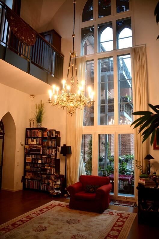 Eine profanisierte Sakralbauarchitektur mit einem wunderschönen Radleuchter im neugothischen Stil zieren das Wohnzimmer dieses Kunden. Diesen Leuchter haben wir für diesen Raum entworfen und in unserer Werkstatt gefertigt.