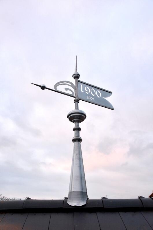 An einem Privathaus wurde ein Aufzugsturm zum barrierefreien Zugang zu den Wohnungen angebaut. Im Stil der Bauzeit wurde für diesen Turm eine Zink-Wetterfahne entworfen, der die Ornamentik des Hauses aufnimmt.